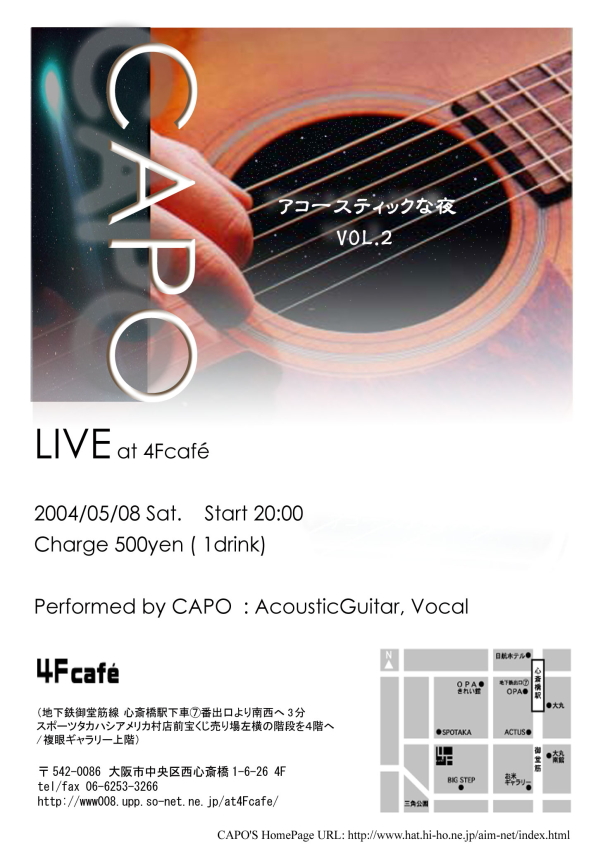 | CAPO's LIVE 「アコースティックな夜」 VOL.2 2004/05/08 Sat. Start 20:00〜 Charge \500 (include 1 drink) at 4Fcafe (地下鉄御堂筋線 心斎橋駅下車7番出口より南西へ3分 スポーツタカハシアメリカ村店前宝くじ売り場左横の階段を4階へ / 複眼ギャラリー上階) |