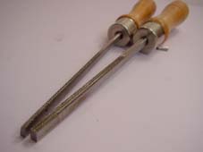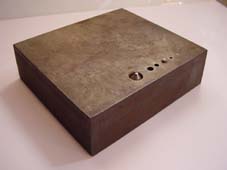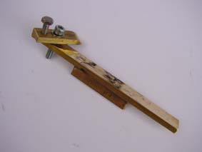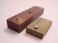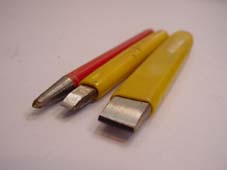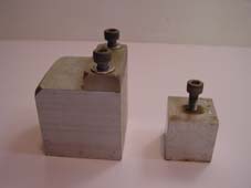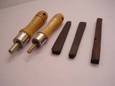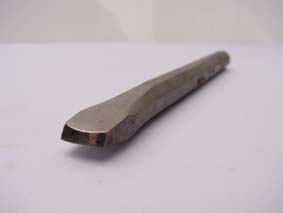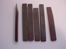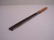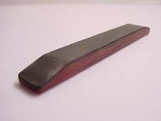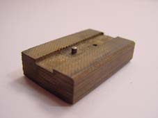 プッシュスティク各種 左からブレード削り大小、大は番手の粗い時、 小は番手の細かい時に。 後の三本は外形削りやバンドソーの時に使う ドリル穴のバリ取り 面取りカッターでも良いのだがこちらの方が お手軽簡単。 平ヤスリの加工 平ヤスリの目の切って無い方の側面を平面に 削る。 そうして使わないと綺麗な直角が出ない。 フライス盤のワーク台#1 フラットバーにチャンネル鋼を溶接後、平面研磨 使い易いように穴やネジ穴を開けて、穴あけや フライス加工に。 フライス盤のワーク台#2 フライス盤用のバイスに挟んでナイフをセットして ネイルマークを入れたり、ワーク台#1にセットして 小物のフライス加工に。 ドレメルを使う時のバイス台としても使う。 テーパータング用スティク タングにネジ穴を開けて使う。 ラッピングスティック 2”〜10”のホイルやフラットに合わせて各種作製 ホロ−用を作る時はそのホイルに#60のベルトを セットして、その辺にある木材をホローに合わせて 削り、木材に#120の布ペーパーを敷いて大まかに 削ったスティクを研磨して仕上げる。 平面用ラッピングスティク 熱処理済ATS34製、微妙に中央を膨らませて台形に 作る。 小さめの平ヤスリの柄を加工しても出来る。 ボルスター材等のヘアーライン入れ用スティク マイカルタに1mmのゴム板を張って作る。 ブレードのヘアーライン入れ用ゴム板 ヘアーラインを入れる時に耐水ペーパーを当てて ブレード全体に一気に入れる。 2本、3本用チェッカリングヤスリ ATS34の6mmの鋼材に溝を切って、タガネで ヤスリ目を入れるその後熱処理。 タイルタガネ各種 先に埋めてある超鋼チップをダイヤモンドヤスリで 使い易いように加工して使う。 ナイフメーカーズバイス ハンドル材の穴あけの時、鋼材の中心線に直角に 穴を開けるために使う。 アルミとニッケルシルバー製 ハンドル材用ドリル各種 切っ先をテーパーに削って摩擦を軽減している。 打ち台 鉄製。 バーキングの脇に置いて、削った鋼材の冷却用のバケツなのですが この水に洗剤を、小さじ一杯ほど溶かし込んで、使用すると 水面に削り粉が、浮かずに全部沈みます。 フォールディングナイフのブレードを研削する時に ブレードを取り付けて使用する。 ステンレス製 薄いハンドル材の平面を研削する時に使用する 黒檀製 ロックバーの平面を出す時にセットして使う 溝を彫っているのはロックバーがくるくる回らない様に するため。 ブレード、スプリングの平面を研削する時にセットして使う。 ヤスリの改造 ロック溝を鋭角に削るためにヤスリを台形に削って使う 使用出来るのは片面のみです。 ネイルタガネ タガネを写真の様に加工して使う。 ブレードの曲がり修正台 鉛を空き缶に入れてガスコンロにかけて溶かし ビールの空き缶に流し込んで固めたもの。 焼き入れ前のブレードを上に乗せプラスティクハンマーで 叩いて修正する。 フォールディング用のブレード磨きの台 ブレードタングを挟んで手仕上げの時に使用 傷が付かない様に、真鍮製 |