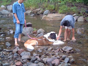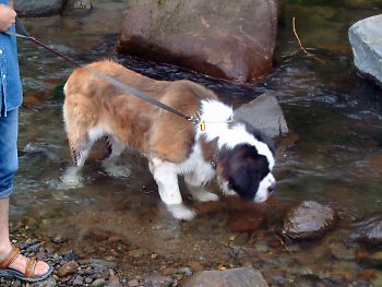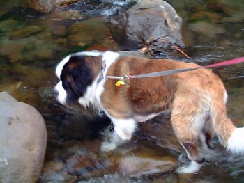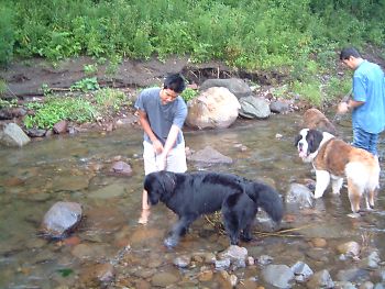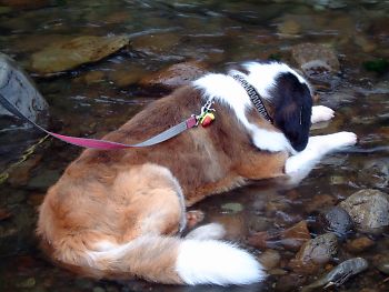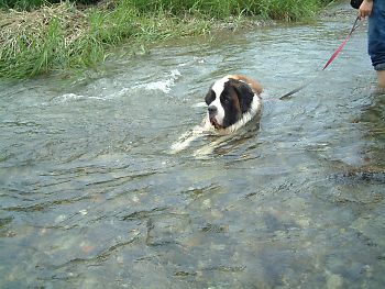 レオンは 、お風呂のように川に浸かってくつろぎ中 |