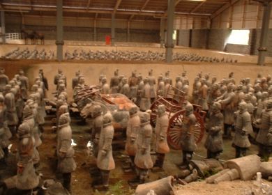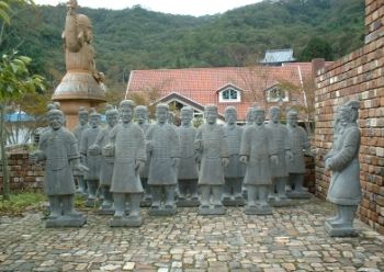 実際の兵馬俑坑を模して地面を2m掘り下げ、本場中国より1000体の素焼きの兵馬俑を、当時と