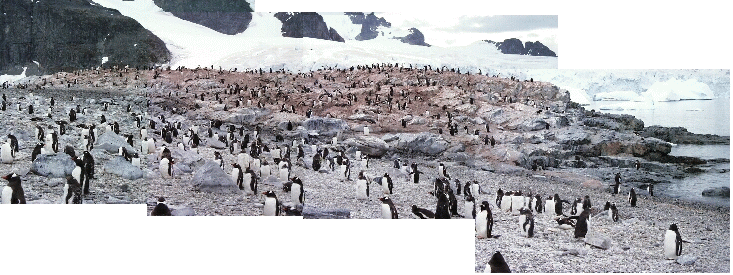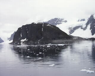 これがクーバービル島の全景! 島の前に広がる海には多くの流氷があり、流氷写真を撮るには好ポイントだったのですが、ペンギン達に夢中になってしまいました。 流氷は僅かにビデオカメラに収めたのみ・・・。 静止画の一枚くらいは撮ってくるんだったと、後で後悔! |