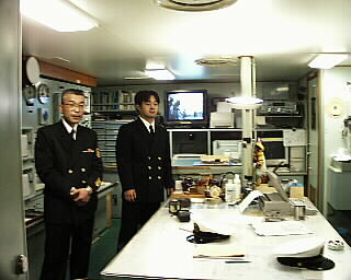 | 「ここにある器材は少し古いんですけどね」と、おっしゃりながらも、丁寧に色々教えてくださった。 奥から2番目のモニターでは気象図を映し出しており、白い枠内(この縮小写真では判別出来ないですね)が、衛星で写すことのできる範囲で、朝8時?分頃、衛星が写した気象写真(日本の上空)を解析中でした。 また、奥から4番目のモニターは南極の氷象図を映し出しているところ。 |