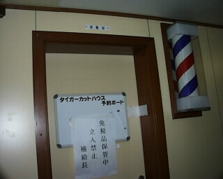 | 理髪室。 その名も「タイガーカットハウス」だそうな! どんな髪型にしてくれるでしょ? そも、タイガーカット、という髪型でもあるのでしょうか? 気になるぅ〜。 そうそう、同じように見学しながら廊下を通りぬけて行く御家族の方が、 「へぇ〜、何でもあるのねぇ、これなら随分安心ネ」 と、つぶやいていらした。 私なぞは只の一般見学者で、半分野次馬的な興味で見ている部分もあるけれど、身内を送り出す家族にしてみれば真剣。 こういった生活面での充実度は、非常に気になるところだろう。 追記:タイガーカット・・・つまりは虎刈り・・・そしてそして辞書で調べてみたら、『虎刈り』=刈り方がへたなために頭髪が不揃いで虎の毛のようにまだらにみえる・こと (頭) だそうで・・・タハハ(^^ゞ なかなか気が利いた命名じゃないの、ネ? |