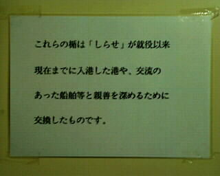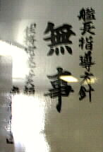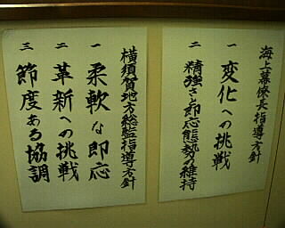 | 上の3点の貼り紙、貼り出し場所が違うのに何故一緒に並べたかというと、士官室にはこの3点が揃って額縁の中、奇麗に並べられていたのだった。 士官室のものも撮影したのだが、ガラス張りの額縁に入っていたため反射で上手く撮れず、辛うじて艦長指導方針だけが、一番大事?な部分に関して判別可能だったので、ここに並べてみた。 |