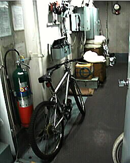 | 艦内廊下で見つけた自転車。 どこで使うのかしら・・・。 追記:これも後にパソコン通信で知ったのですが、途中寄港するフリーマントルで使われることがあるようだ。 |