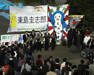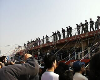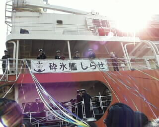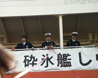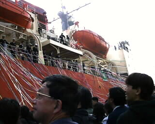 出港セレモニーも終わり、家族&報道関係者退艦の時。 艦と岸壁を繋ぐ階段を目指しつつ行列待ちしていると、岸壁には、まだ乗り込んでいない観測隊の人達と見送りの人達の姿が・・・。 |
