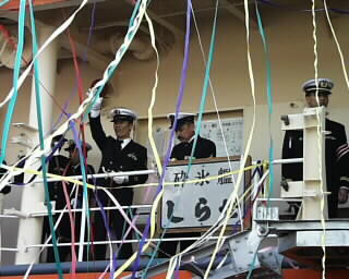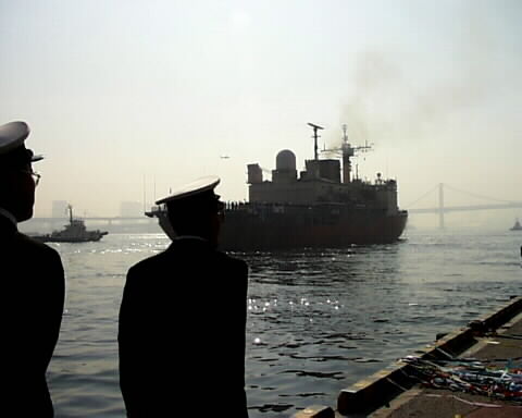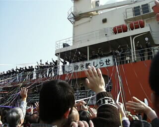 と、突然、艦が岸壁より離れる。 乗っている方達も制帽を手に、最後のお別れ。 |