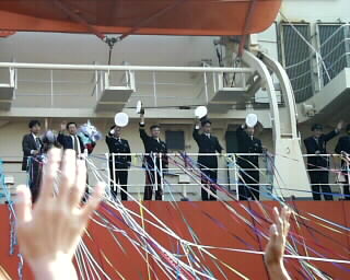 | おお、これが噂に名高い“テープの雨”の始まりね? でも、テープを投げ合っている時は、お互いに結構アブナイ。 私が退艦待ちの行列に並んでいる最中も、ヒュンッヒュンッ!とテープつぶてが飛んできて、顔のすぐ脇を摺り抜けて落ちていった・・・。 あの勢いからして、もし当たったら、結構痛いのではないかしらん? んでもでもネ。 たとえ当たったとしても、誰も文句を言う人はいないだろうナ。(^_^)/ |
