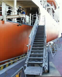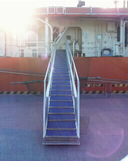 | “しらせ”側面の、もう一つの乗り組み口階段。 出港時には作業車が外すようだ。 |