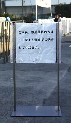 | 時間はまだ8時を過ぎたばかりの頃、最初はどことなく立て置かれていたのが、後で外される?乗り込み口階段の手前に、改めて立て置かれた。 実は今回の“しらせ”の出港と見学の件、他のサイトでの掲示板で知ったのだ。 その時は、「内部も一般に公開され、ブリッジの見学も出来ます」と教えていただいていたので、まさかここにきて、御家族・報道関係者のことについてだけ書かれているとは思わなかった。 途端に「じゃぁ家族でも報道関係でもない私は中には入れないのかしら?」と不安に・・・。 でも逆に、「一般見学はお断り」とも言及されていない。 ただただ何もせずに指を咥えて見ているのは口惜しい!まずは聞いてみよう! と、入り口周囲にいらっしゃる関係者(乗り組み員)らしい方に問い合わせてみる。 すると、 「いいよ、でも11時過ぎには皆降ろされるのよ」 と、お許しを頂くことが出来た。 やったぁー!!! 内心小躍りせんばかりに、8時半の乗艦開始の時を待つ。 |
