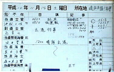 中央乗り込み口階段を上がったところにあったホワイトボード。 この時はまだ内部見学させてもらえるかどうか分からずに、岸壁から撮った。 ・・・なため、大きなオリジナル画像からそのまま当該部分をトリミングしても、映りが悪い。 |