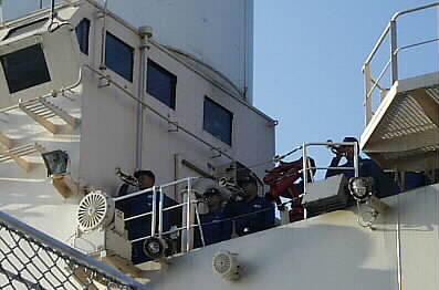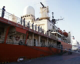| 突然どこからともなくラッパの音・・・。 音源を捜して目線を上げてみると、気象観測用レーダーのドームの脇、乗組員の人達がラッパを吹いていた。 一体何の合図だったのだろう? (追記:08:00の自衛艦旗掲揚時のものだそうです) |