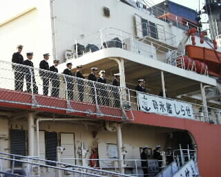 そして少しづつ、船の上や中から外を眺める人(乗組員さんや観測隊の方達)が増え始める。 もしかして見送りに来る家族を見つけようとしてるのかしらん? |