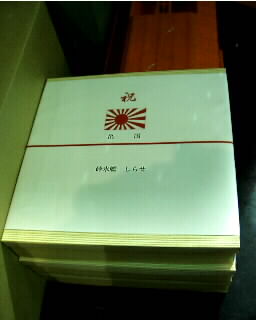 やはり片隅で見つけたお祝いの品の箱。 この写真だと見辛いけれど、 『祝 出港 砕氷艦 しらせ』 となっている。 中身は一体何だったのだろう? もしやしてお弁当か? (ということを、後に見学する厨房の献立表から想像・・・) |